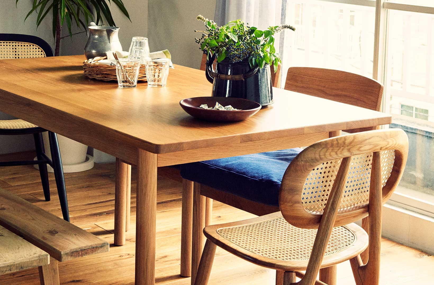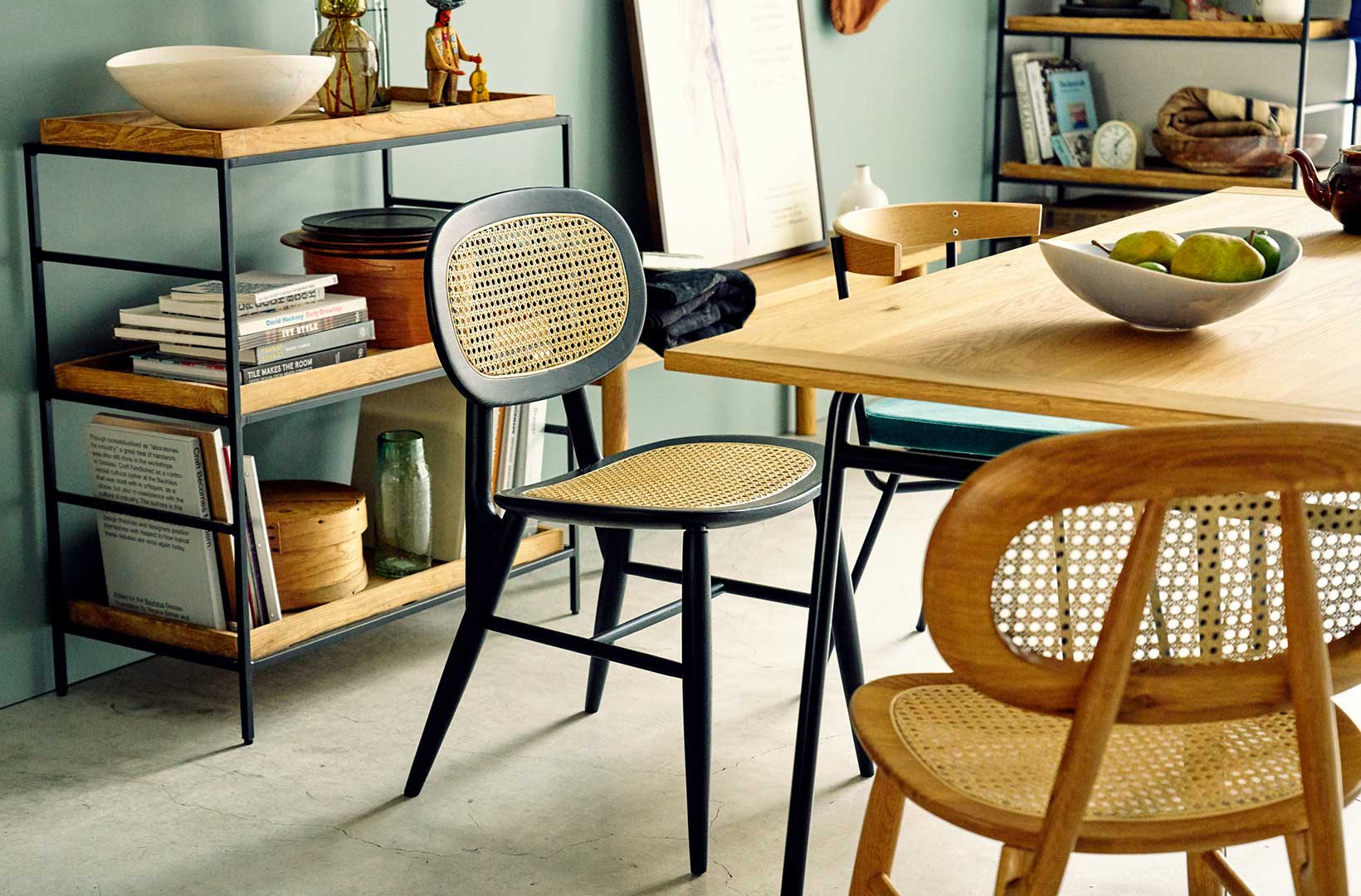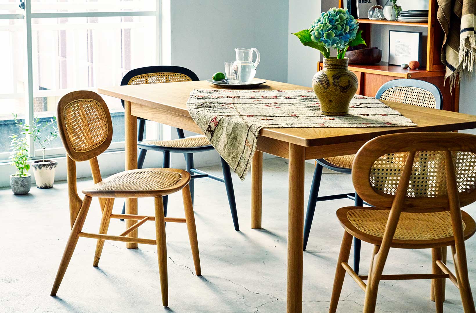 オーク無垢材を使い、細部にまでこだわった曲線美と、中世を思わせるアイコンとしてラタンのケインメッシュ(格子細工)が軽やかな表情を添えた、洗練された佇まい。美しいフォルムの中に軽さと耐久性も兼ね備えた、実用性の高さも魅力です。クラシックとモダンが調和したやわらかな存在感が、日々の暮らしに穏やかな空気をもたらします。